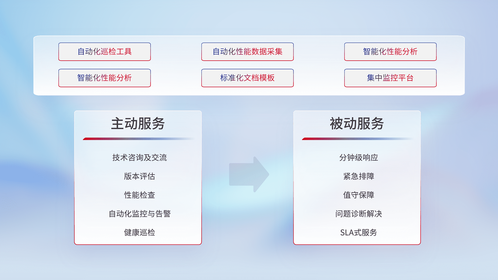 智能化工具和标准化文档,,,,保障服务质量,,,提供主动服务(包含技术咨询、、版本评估、、、、性能检查、、、自动化监控与告警、、健康巡检)和被动服务包含(分钟级响应、、、紧急排障、、、、值守保障、、问题诊断解决、、SLA服务)。。。